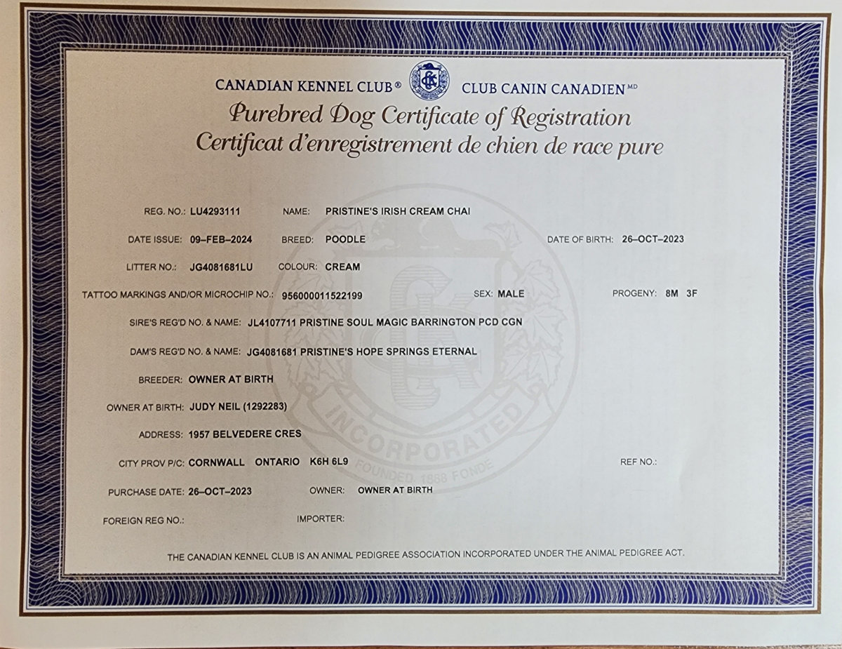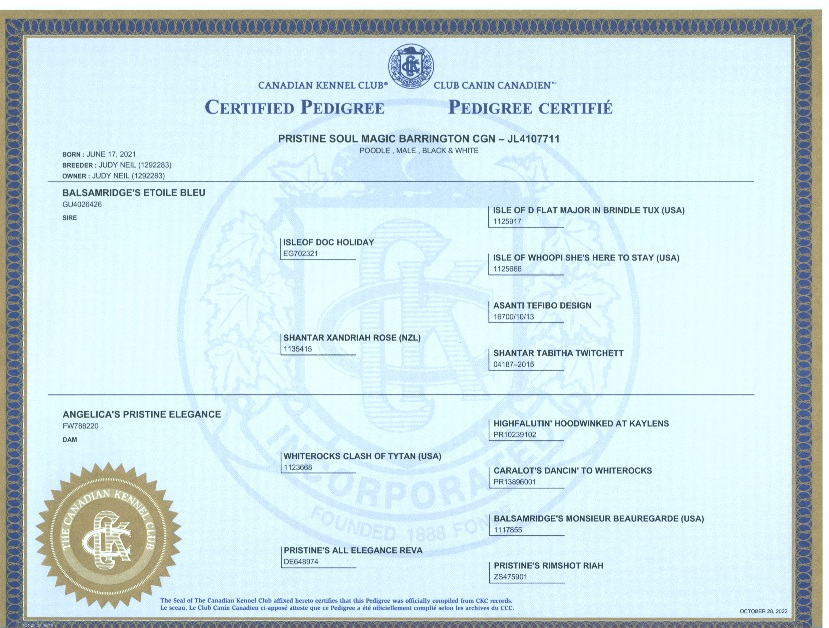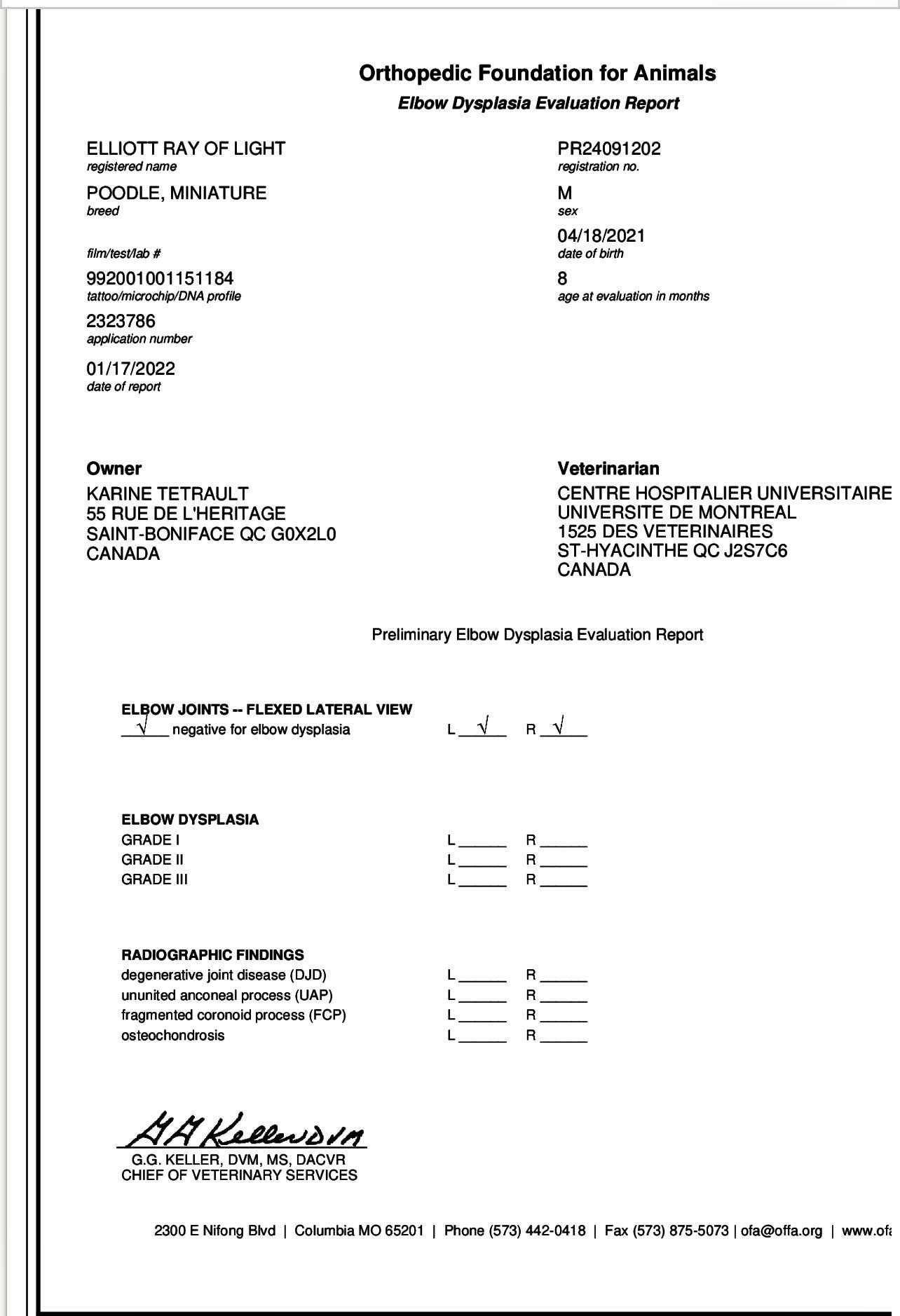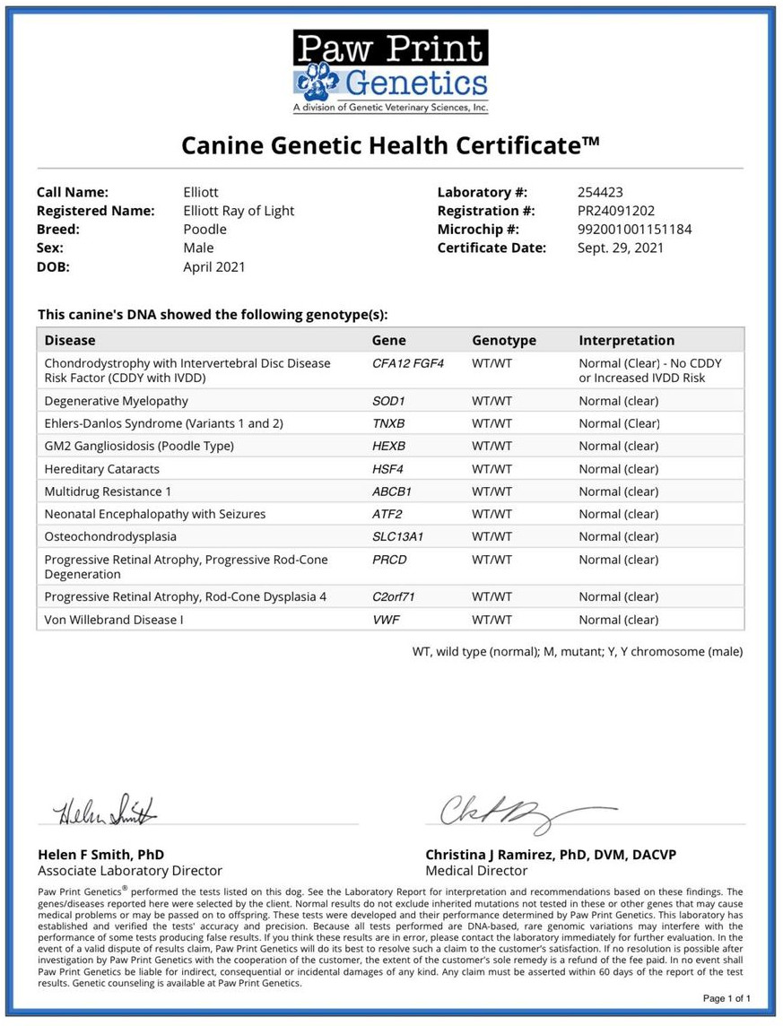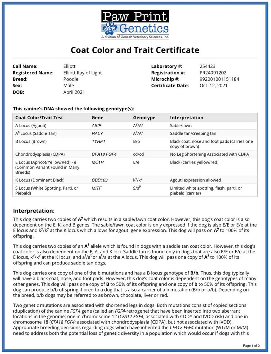Certificates Degenerative Myelopathy -clear Neonatal Encephalopathy -clear Vonwillebrand’s-carrier Cerf -clear Eyes OFA -clear Heart -Normal Hips -prelim -Fair DNA Analysis |
