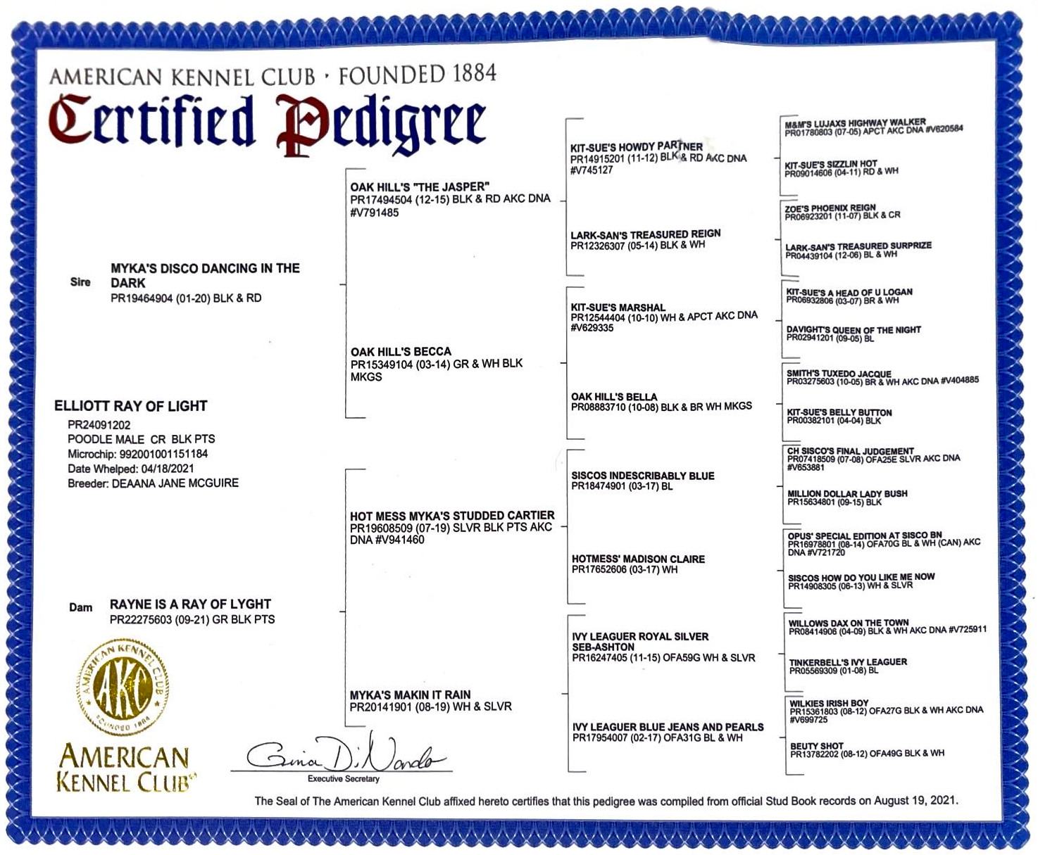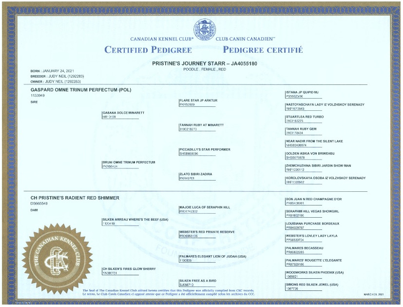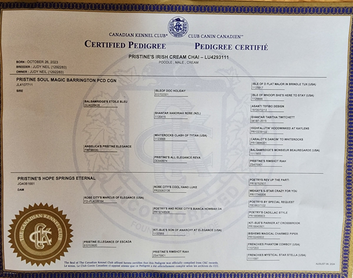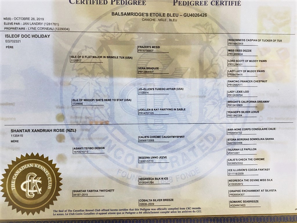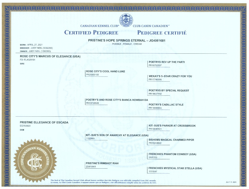 Certificates Degenerative Myelopathy -clear Neonatal Encephalopathy -clear Vonwillebrand’s-carrier Cerf -clear Eyes OFA -clear Heart -Normal Hips -prelim -Fair DNA Analysis |