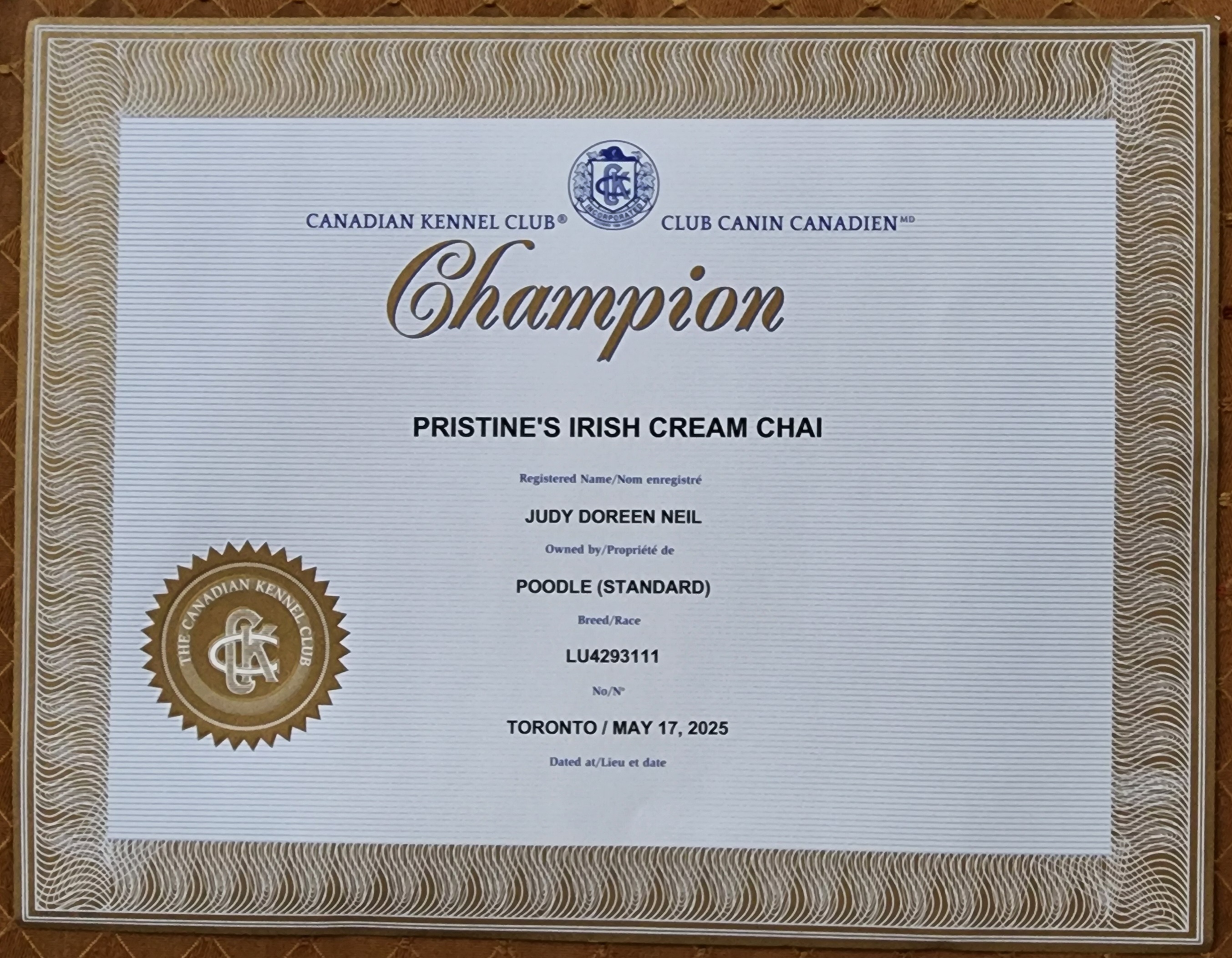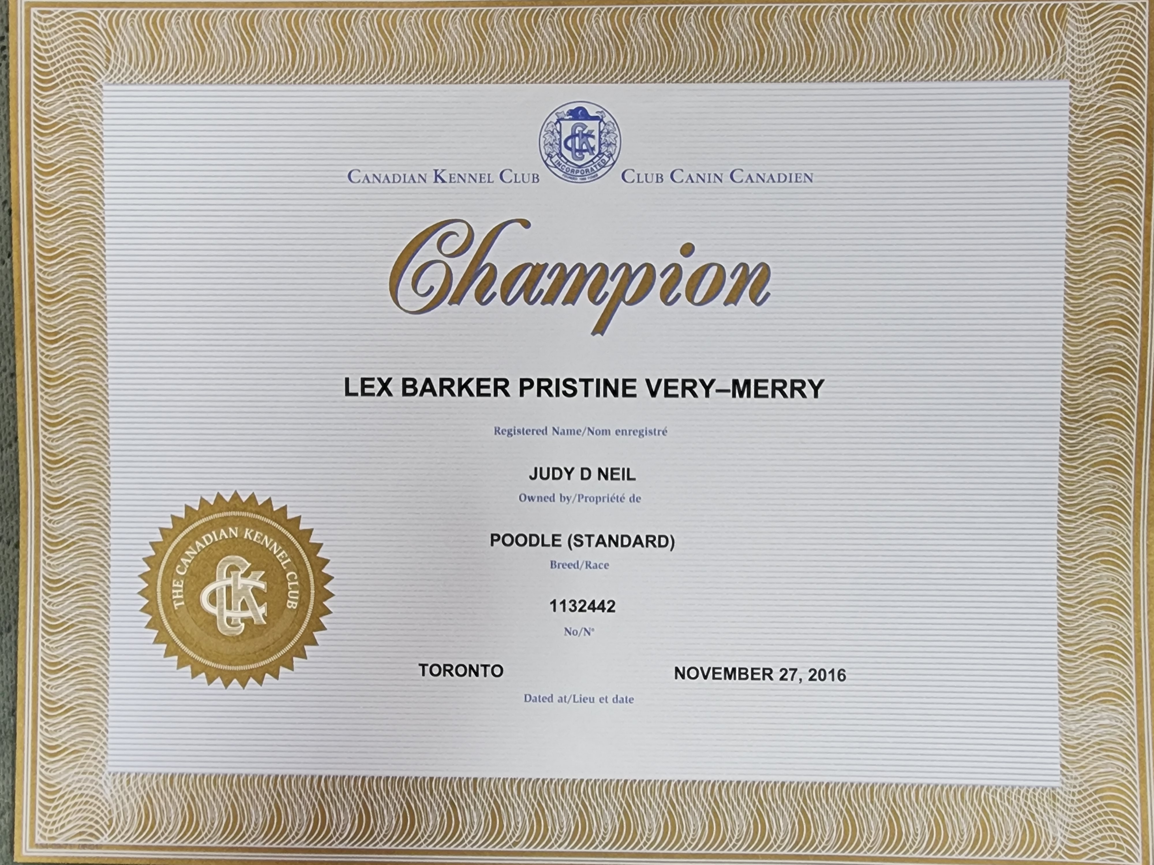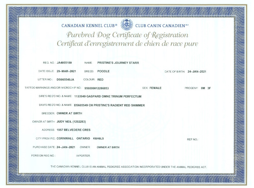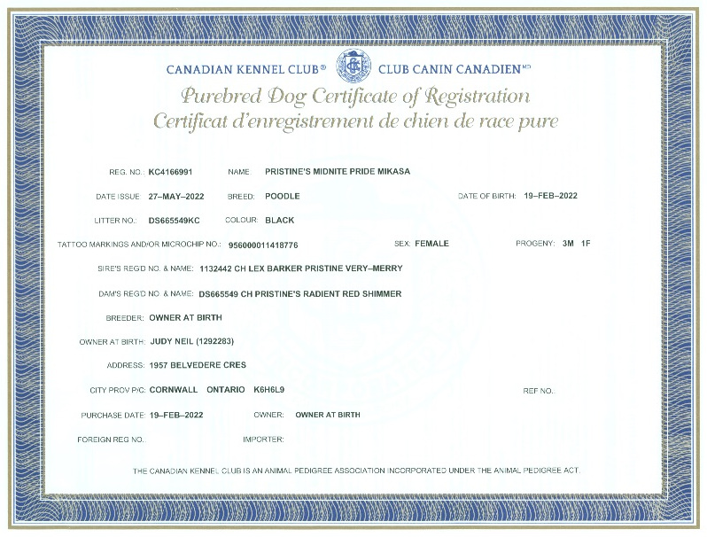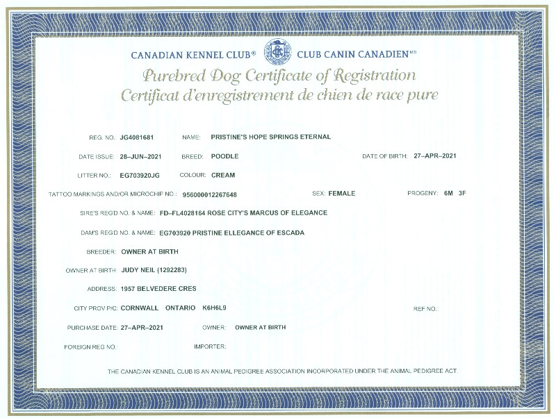 Certificates Degenerative Myelopathy -clear Neonatal Encephalopathy -clear Vonwillebrand’s-carrier Cerf -clear Eyes OFA -clear Heart -Normal Hips -prelim -Fair DNA Analysis |