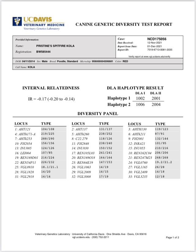 Certificates Degenerative Myelopathy -carrier Neonatal Encephalopathy -clear VWD-clear through parentage Elbows OFA -normal Eyes OFA -clear Hips OFA -excellent Heart OFA -normal SA -clear Certificate CHIC# 106698 Genetic Diversity Analysis |